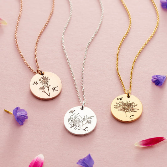 This unique engraved necklace features your chosen birth flower and initials. This design makes the...