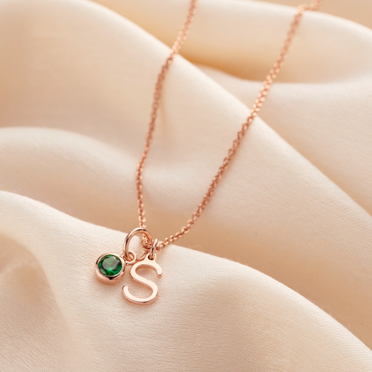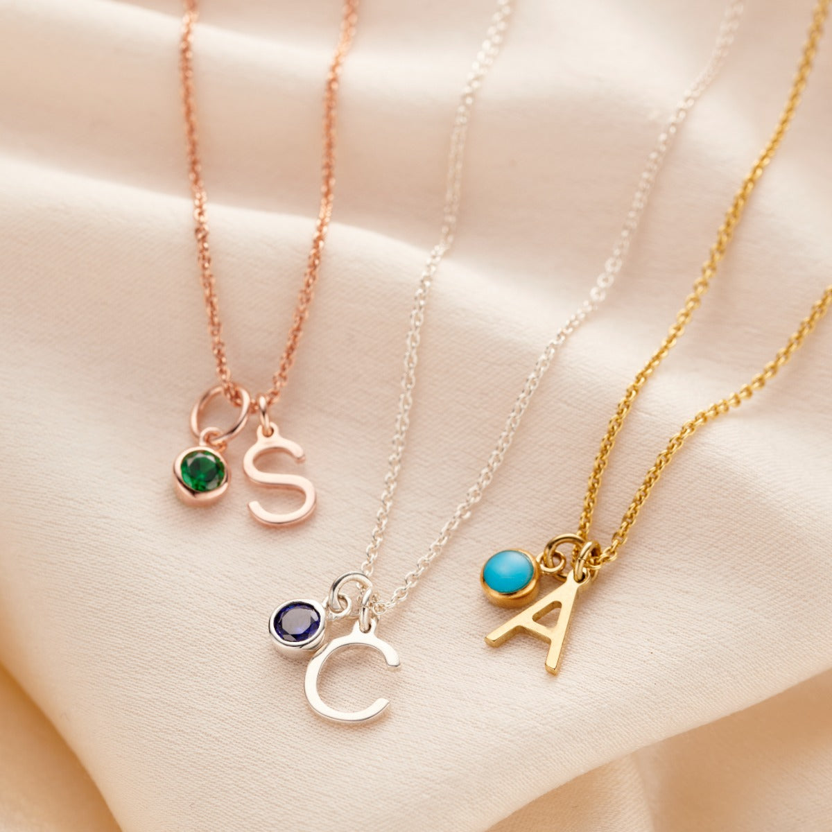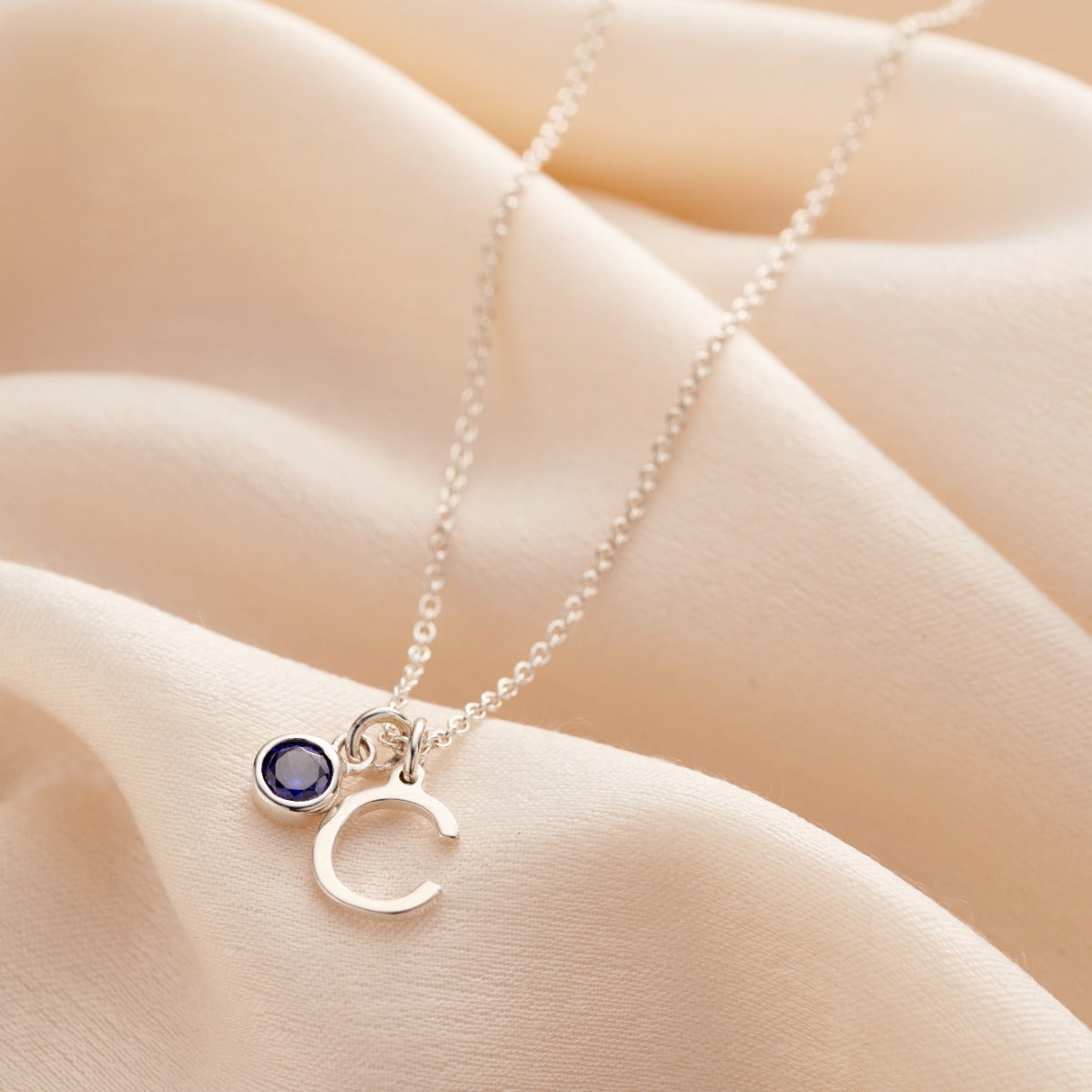 This beautiful initial and birthstone necklace is made from Sterling Silver. Featuring a stunning trace chain necklace adorned with your chosen birthstone charm and your chosen letter charm. We think it's the perfect gift for a loved one, especially on their birthday! For an extra touch of luxe, our jewellers can plate this necklace in your choice of 18ct Yellow Gold or 18ct Rose Gold.