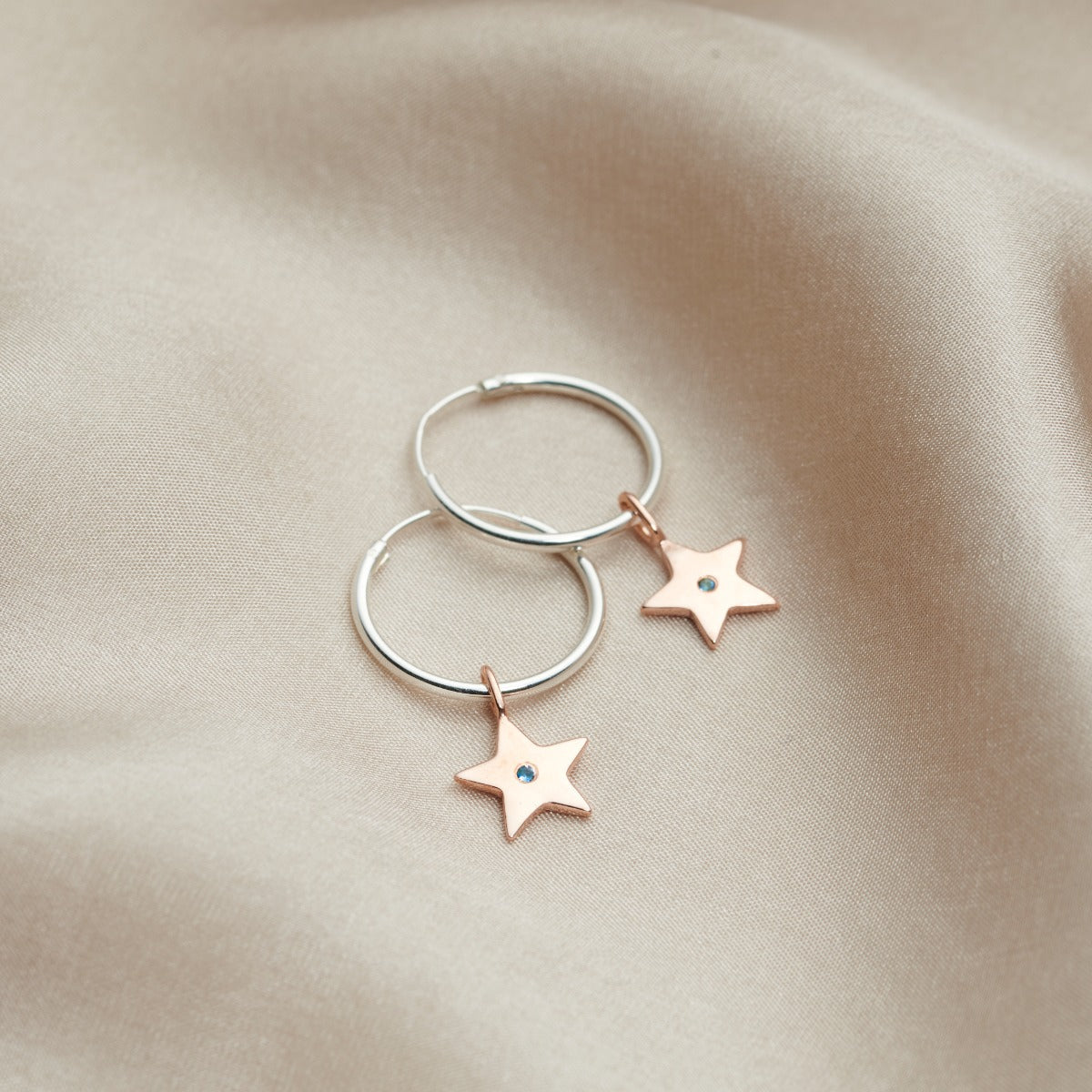 These stunning silver hoop earrings are a special take on our popular star hoop earrings. Featuring handset birthstones of your choice and with optional 18ct gold plating for the star charms. A truly unique personalised gift for someone special. Whilst you can choose to have your own birthstones on the sterling silver star charms, we often see customers choosing the birthstones of their children. Aternatively, you could choose your birthstone and the birthstone of your partner.