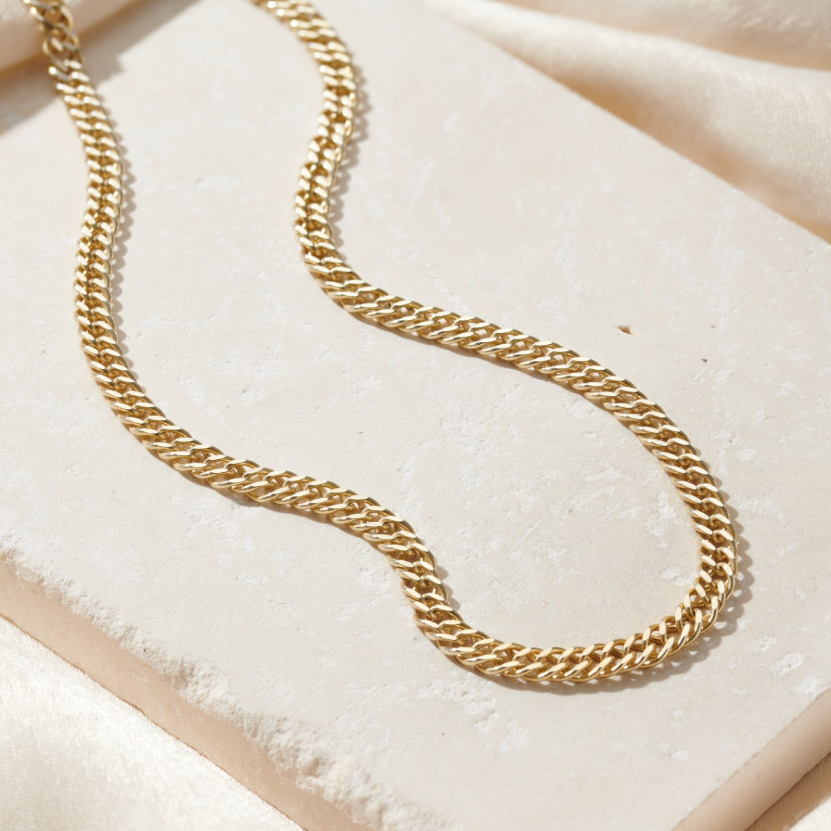 This gorgeous take on the classic curb chain is made from solid sterling silver. This design sees an addition of a double link which creates a unique chain design. The chain is finished with a luxury 18ct yellow gold plate.