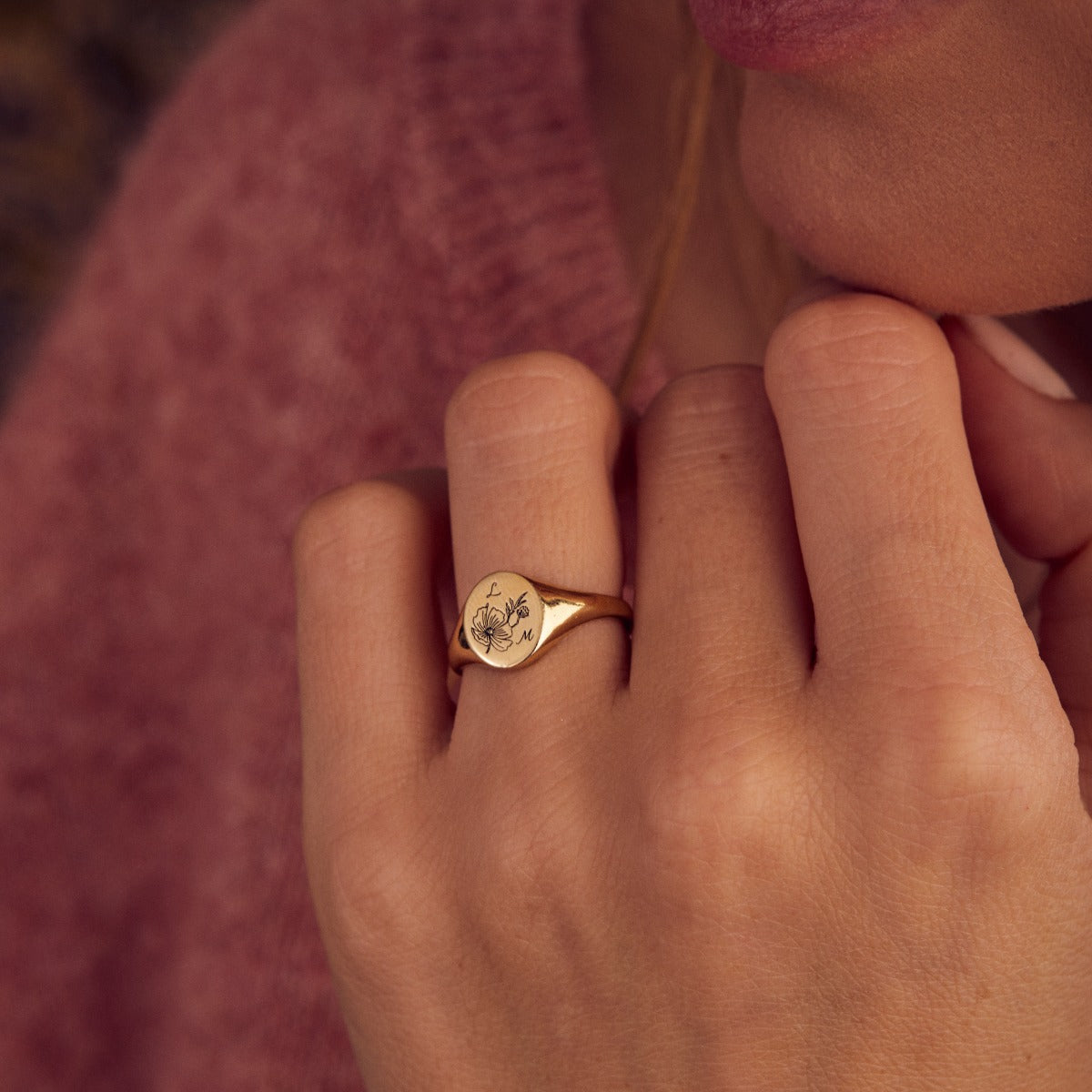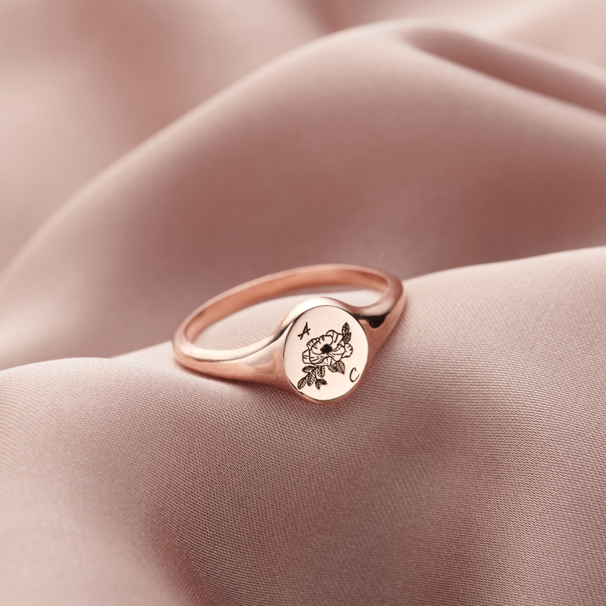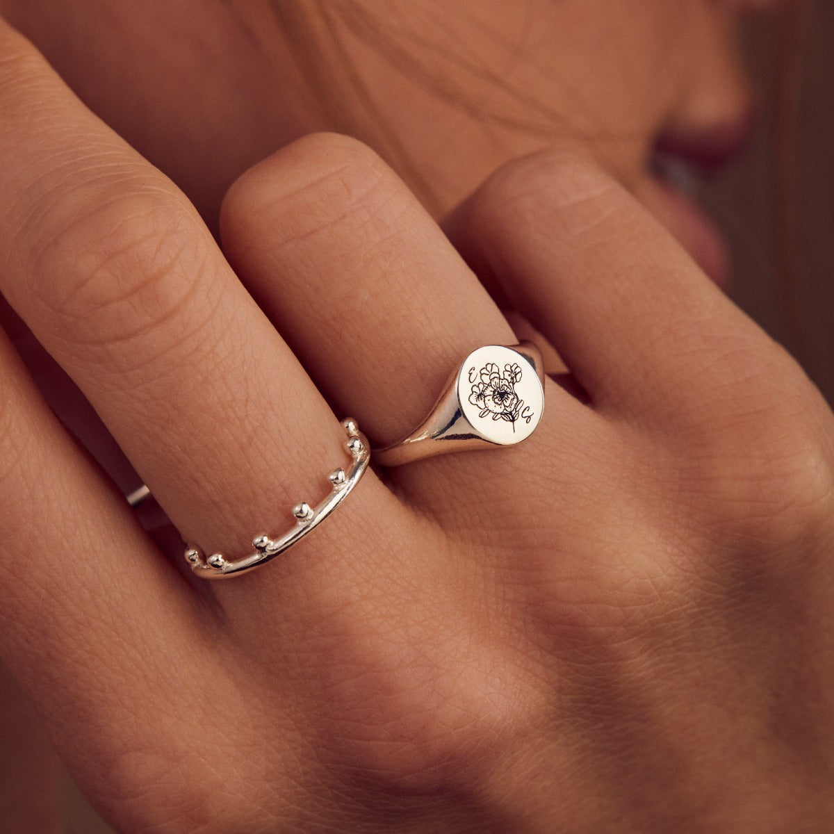 This unique personalised signet ring is made from pure Sterling silver. Pick your birth flower and your initials and our jewellers will engrave them onto the bezel of the ring. We can also plate each ring in your choice of 18ct Yellow Gold or 18ct Rose Gold plating. The perfect meaningful gift for a loved one or a treat for yourself.