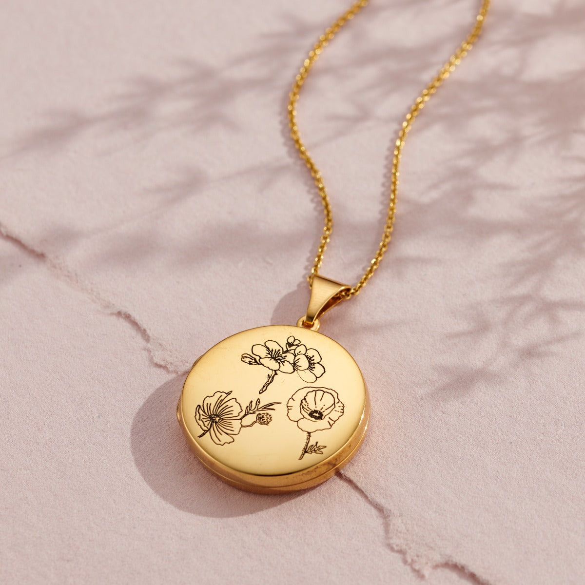 This beautiful locket is made from stunning Sterling Silver. Measuring around 1 inch across, plenty of room for our jewellers to engrave up to three birth flowers onto the front of the locket. Perfect for a small family, with a birth flower for each parent and one for their little one. We love that you can add a photo of your choosing onto each inside side of your locket too, or a little keepsake you want to keep close to heart.