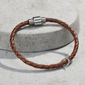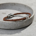 This popular personalised men's bracelet is made from leather and finished with a magnetic steel clasp. The bracelet is adorned with up to three of our mini-message charms. Each charm is made from high quality recycled sterling silver and personalised with your words, names or dates using our signature hand-stamping personalisation method. This personalised men's leather bracelet is the ultimate perfect gift for him.