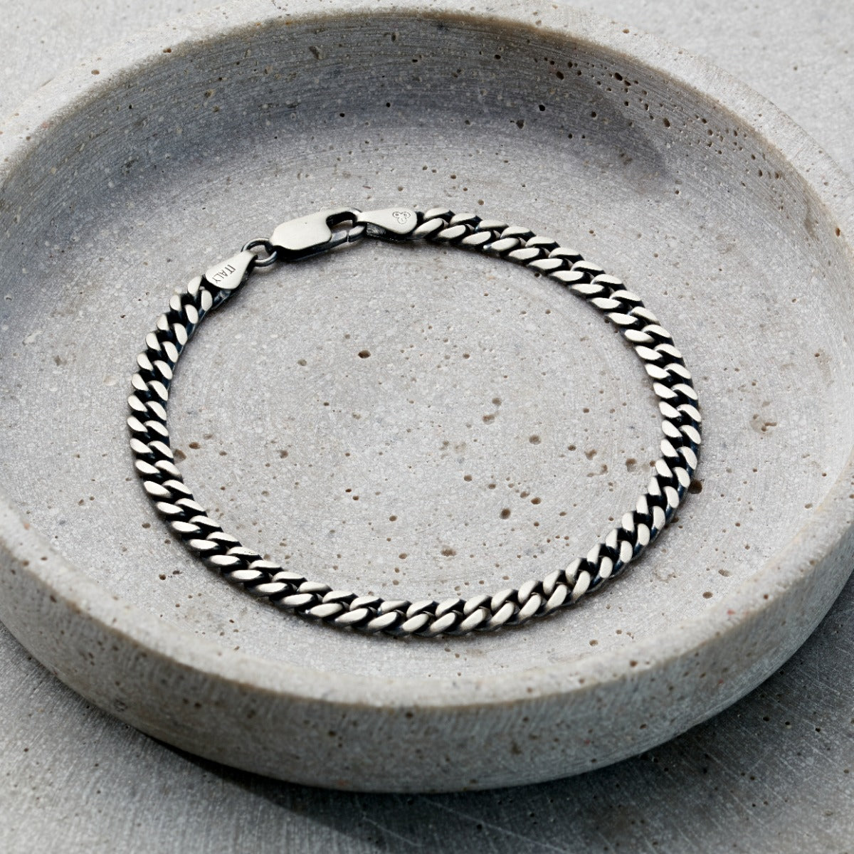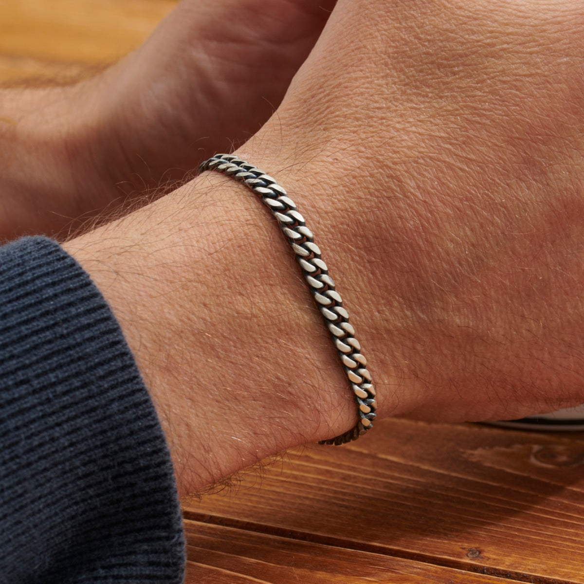 This men's silver chain bracelet is made from beautiful sterling silver. The classic silver curb bracelet features a lobster clasp for easy wear. This silver bracelet is given a unique finish using an oxidisation process, giving the sterling silver on the curb bracelet a beautiful patina.
