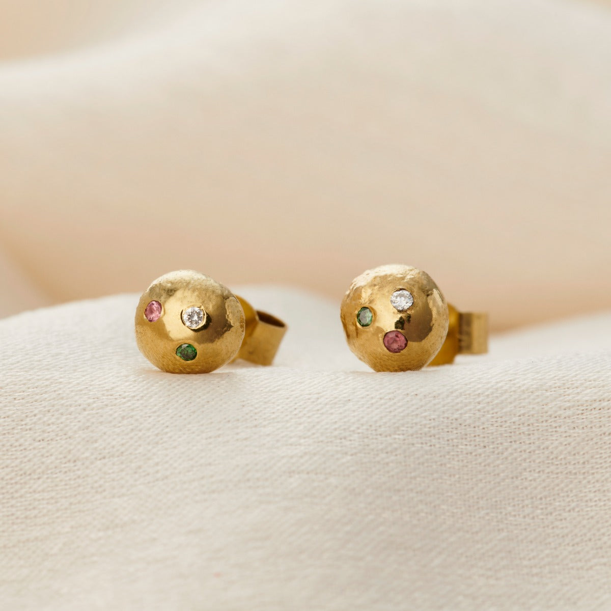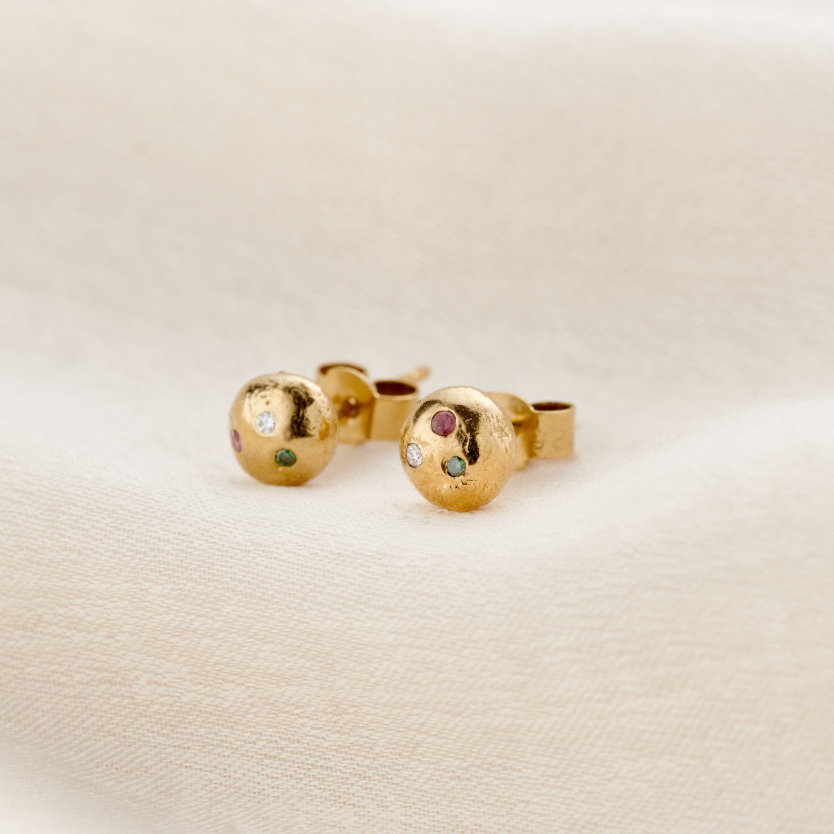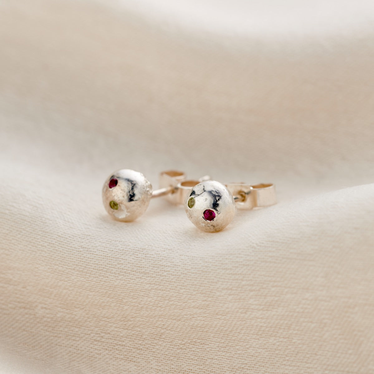 These unique birthstone earrings are made by hand by our jewellers. Using Sterling Silver recycled here in our workshop, each stud is formed using a method that will make each one truly unique. Our jeweller's can handset your chosen birthstone into each stud. With the option to add up to three birthstones per stud these birthstone stud earrings are the perfect personalised gift for mums to many.