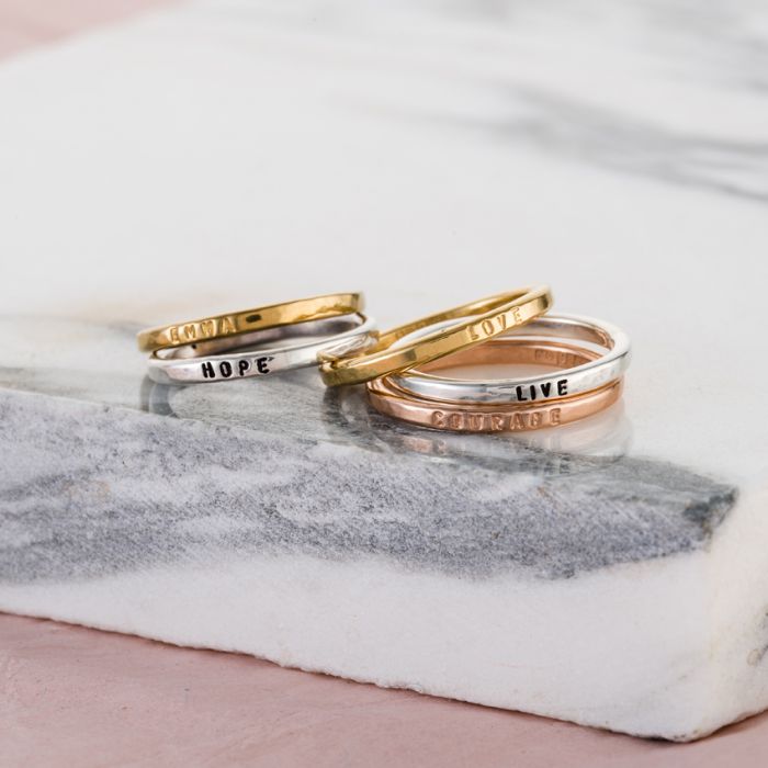 These Personalised stacker rings are handmade by our expert jewellers in our Brighton work. Made from solid Sterling Silver with a unique lightly hammered finish. Each ring can be personalised with your meaning full words. Popular personalisation include names, special dates and locations. Your memory will be close to heart with this set of two personalised rings. If you prefer the look of gold or hue of rose gold we can plate your rings in 18ct gold.