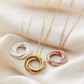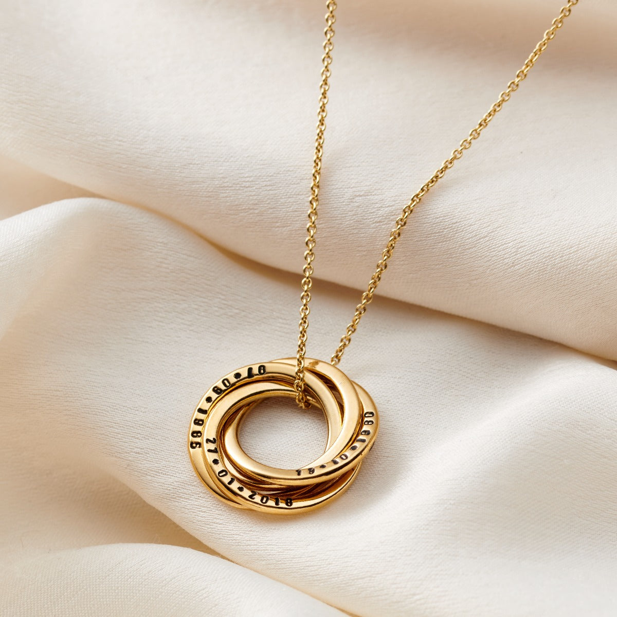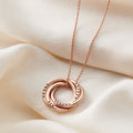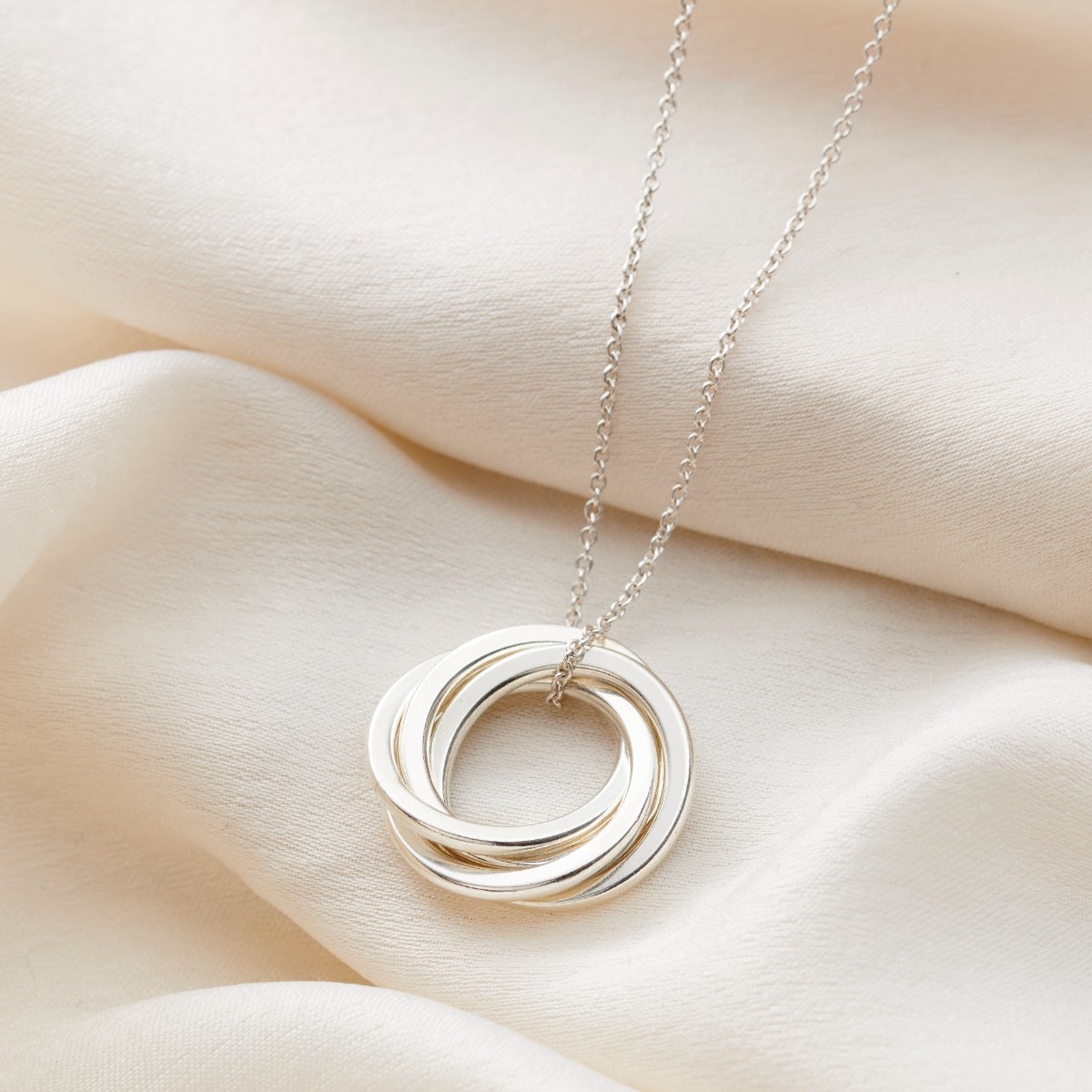 The beautiful Personalised Four Ring Russian Necklace is a variation of our bestselling Personalised Russian Ring Necklace, with an extra ring to allow even more personalisation. Perfect for large families with lots of names to fit on! The Personalised Four Ring Russian Necklace is handcrafted from Sterling silver in our Brighton workshop, with optional 18ct rose or 18ct yellow gold plating. Our Russian Ring Necklaces are designed with intertwining rings; a symbol of everlasting love. For a unique touch, each ring can be personalised with your own unique message, up to 12 characters on each ring. Popular personalisations are family names, special dates, initials, meaningful quotes and personal sentiments. The Personalised Four Ring Russian Necklace makes a wonderful gift for any occasion.