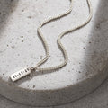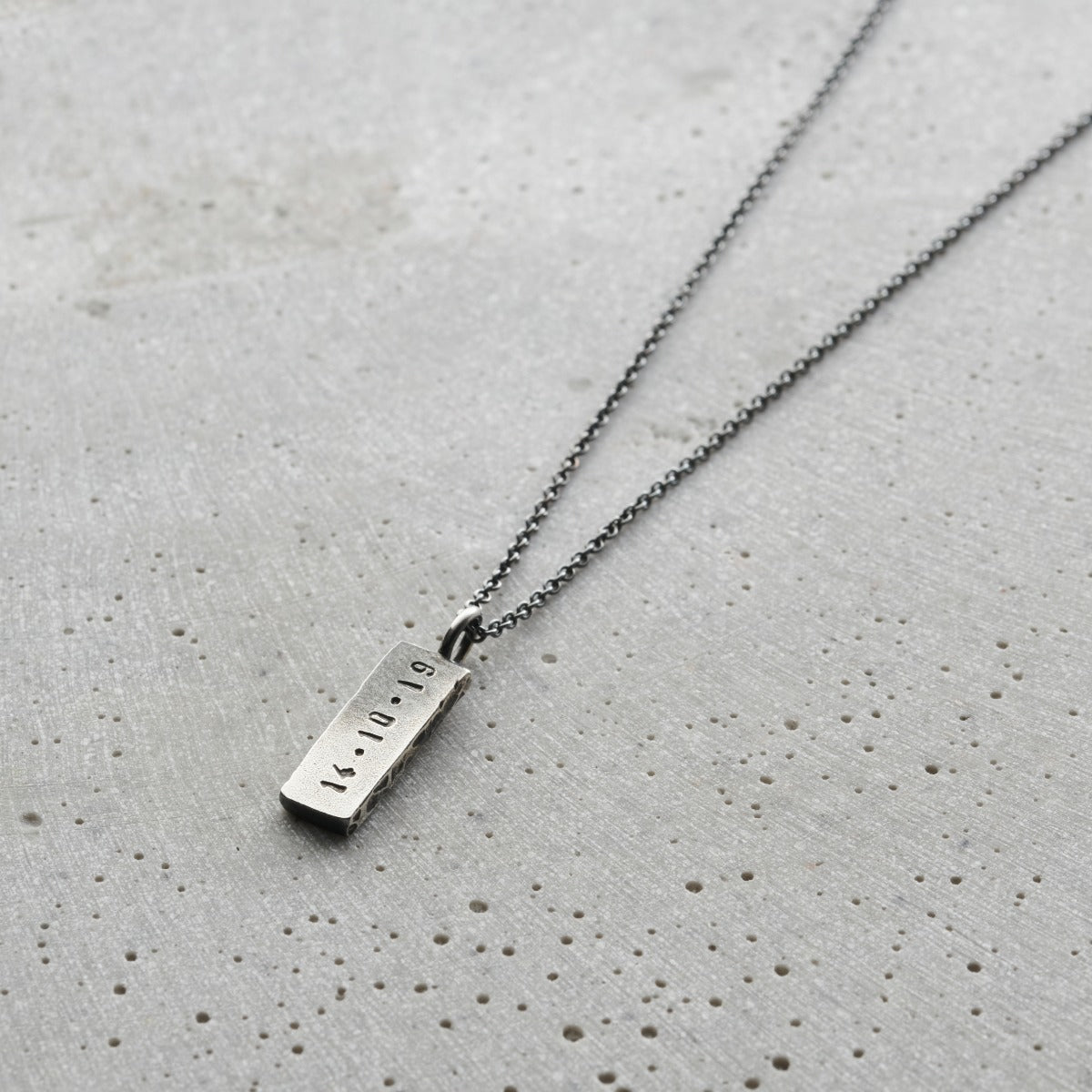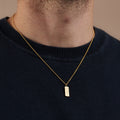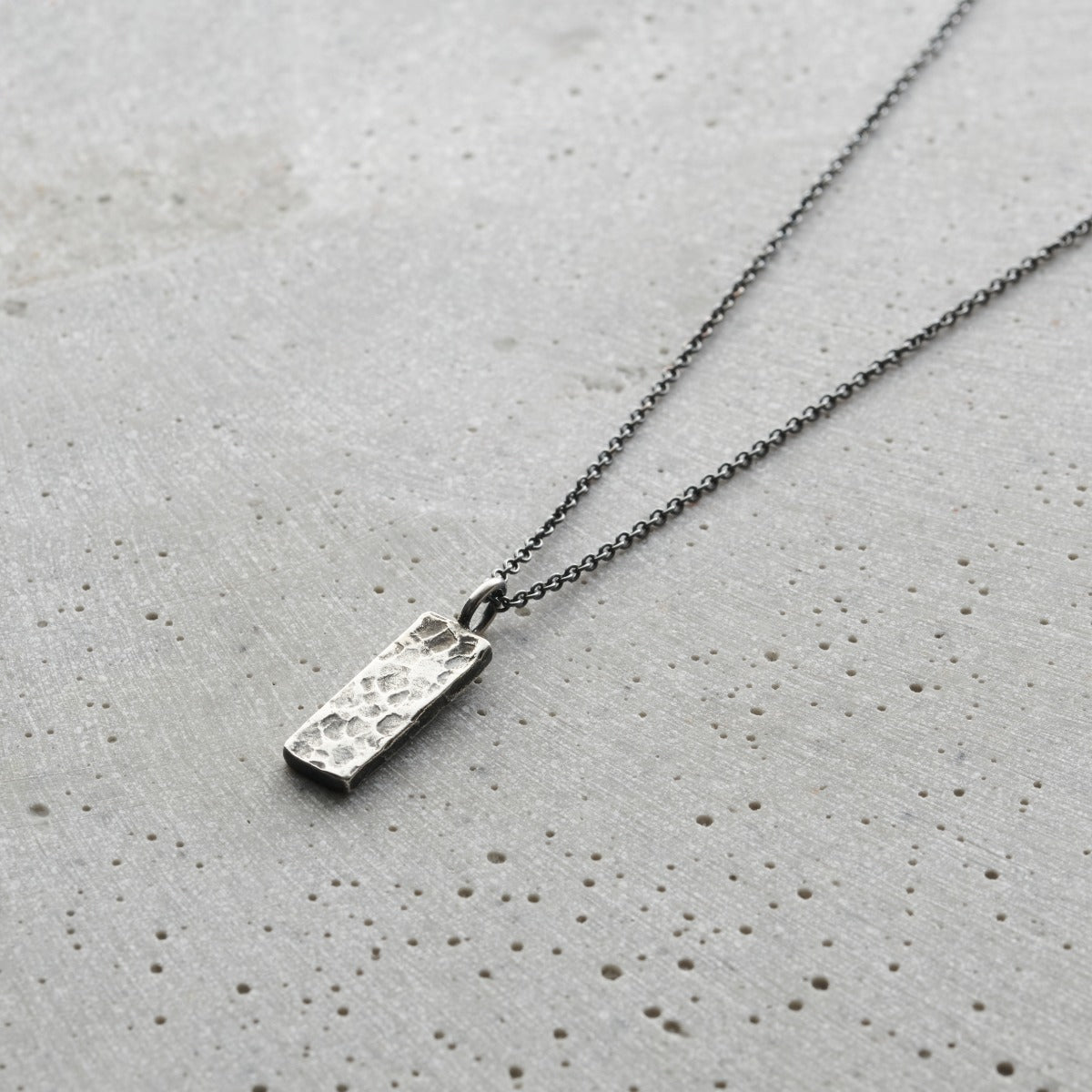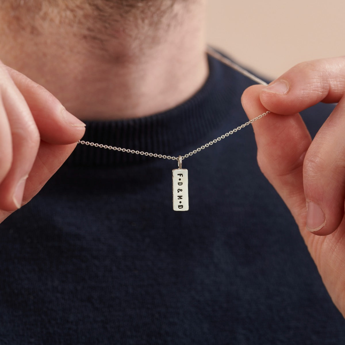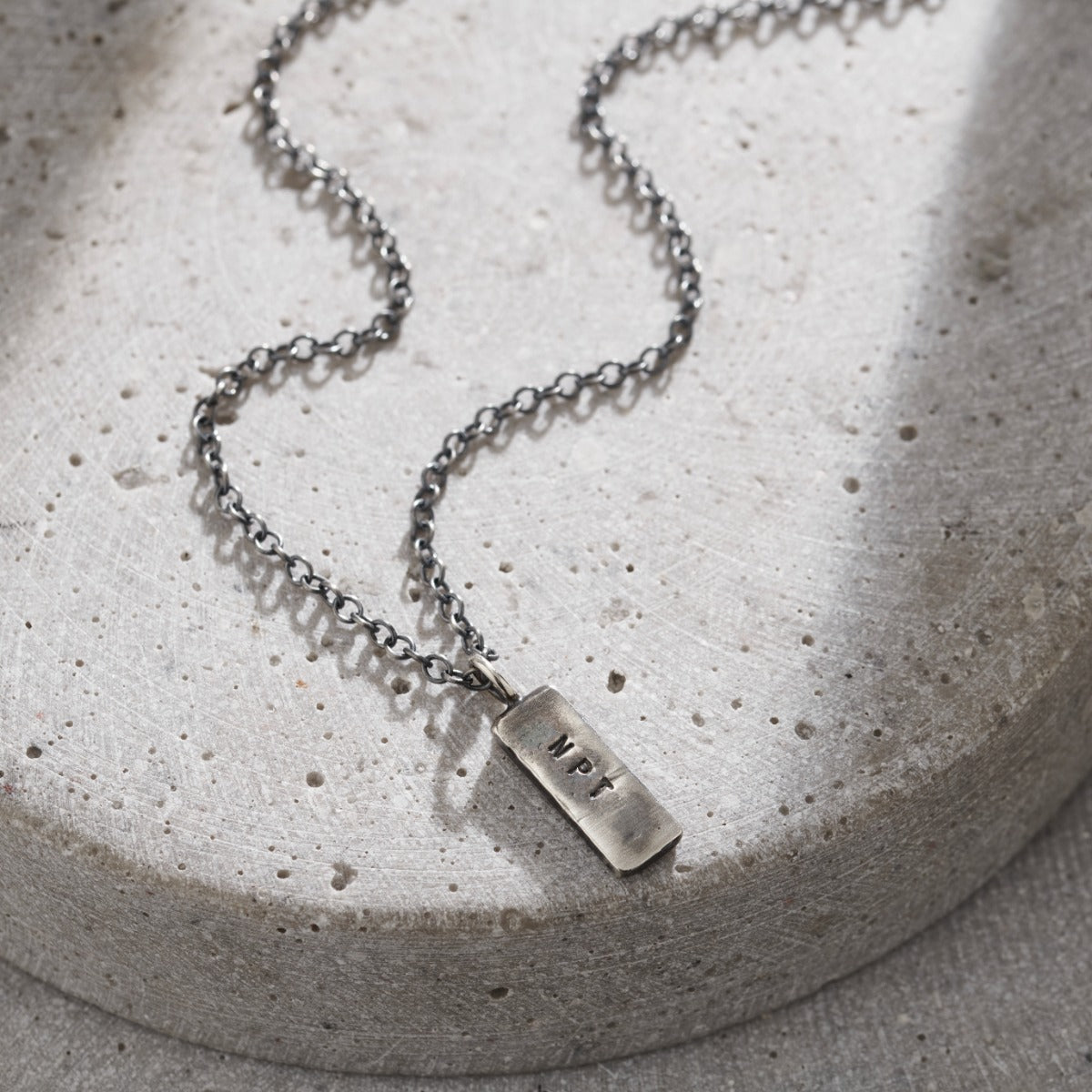 A Stunning personalised men's necklace featuring a solid silver tag hung from a sterling silver chain. Handmade by our in-house jewellers, each tag charm features a hand-textured finish on one side and your chosen personalisation on the other. The necklace can be plated in 18ct gold or oxidised or a unique patina finish.