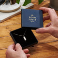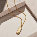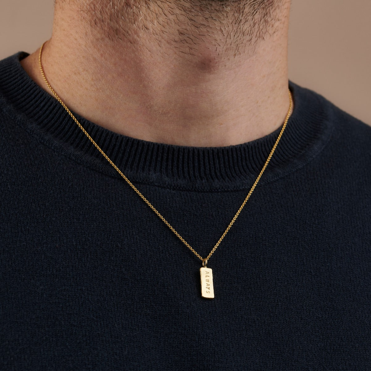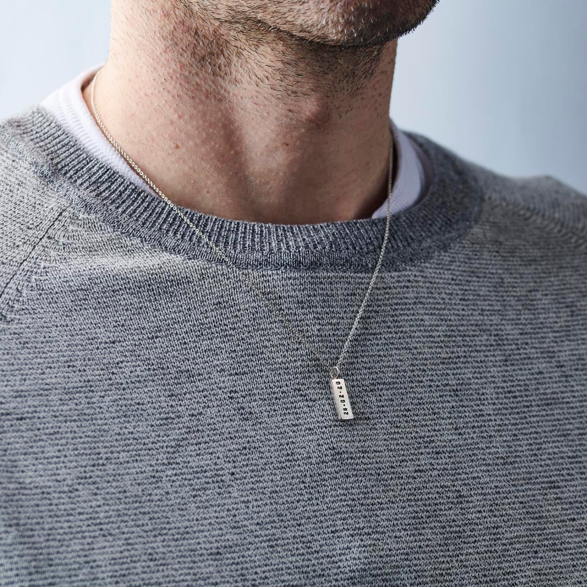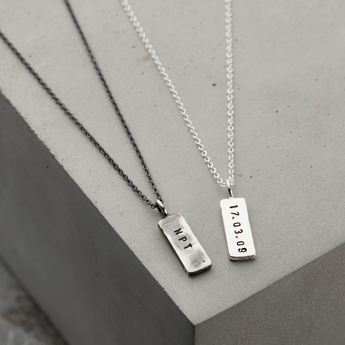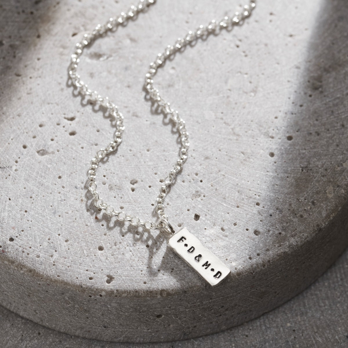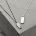 A Stunning personalised men's necklace featuring a solid silver tag hung from a sterling silver chain. Handmade by our in-house jewellers, each tag charm features a hand-textured finish on one side and your chosen personalisation on the other. The necklace can be plated in 18ct gold or oxidised or a unique patina finish.