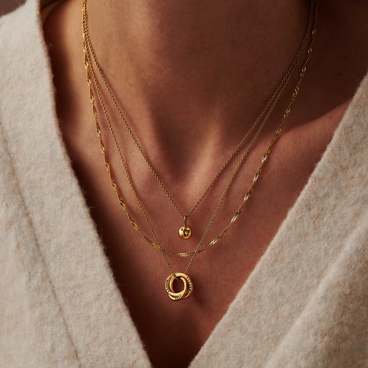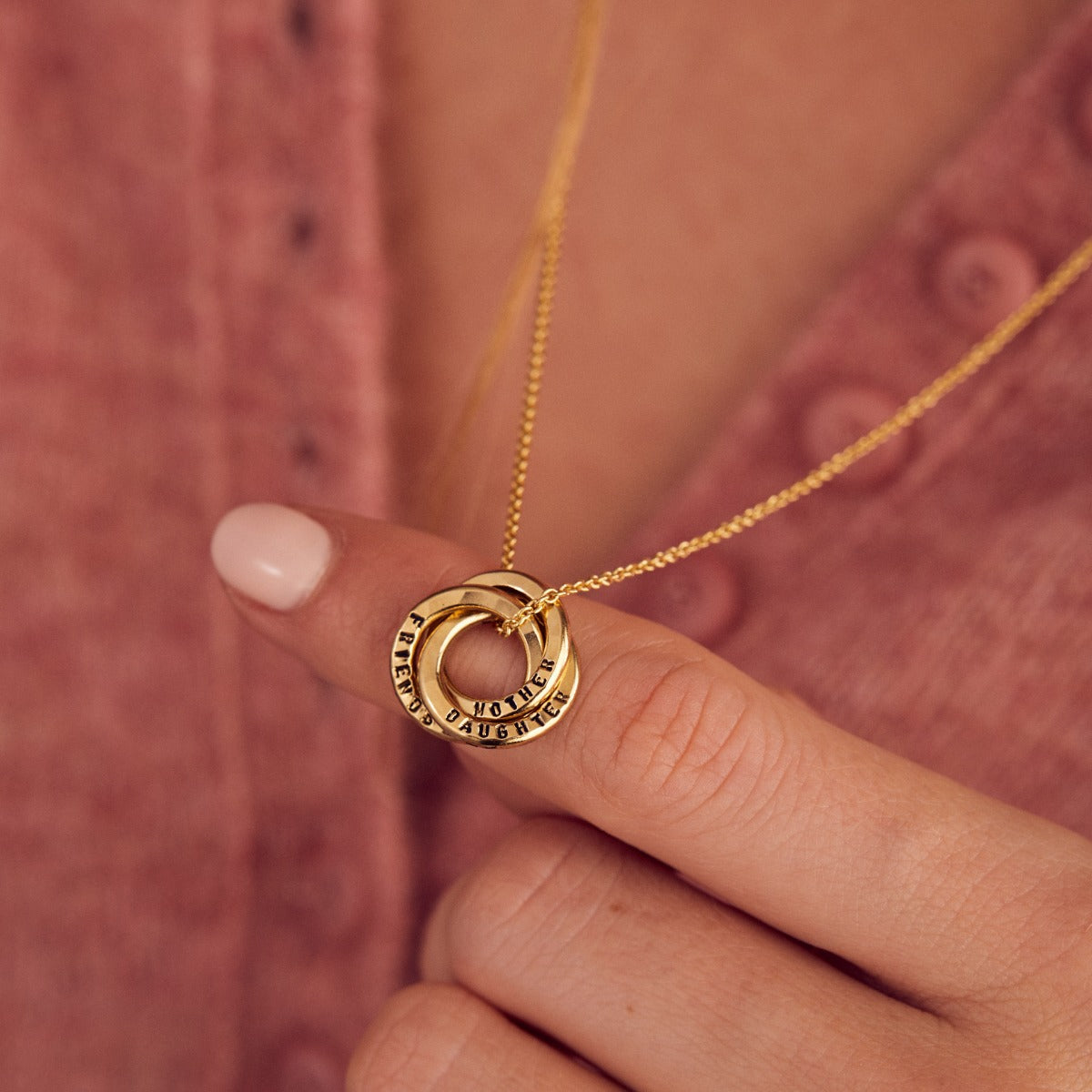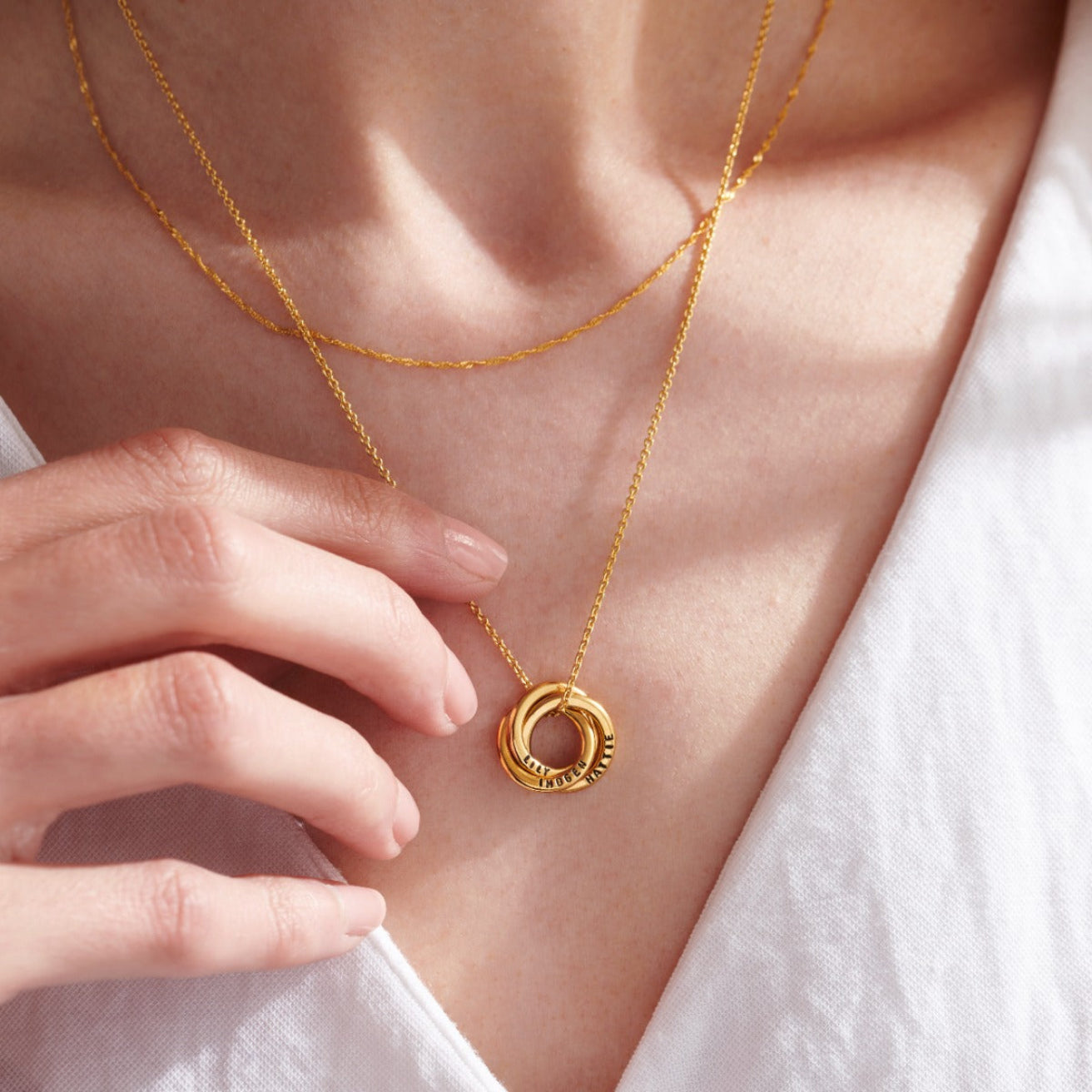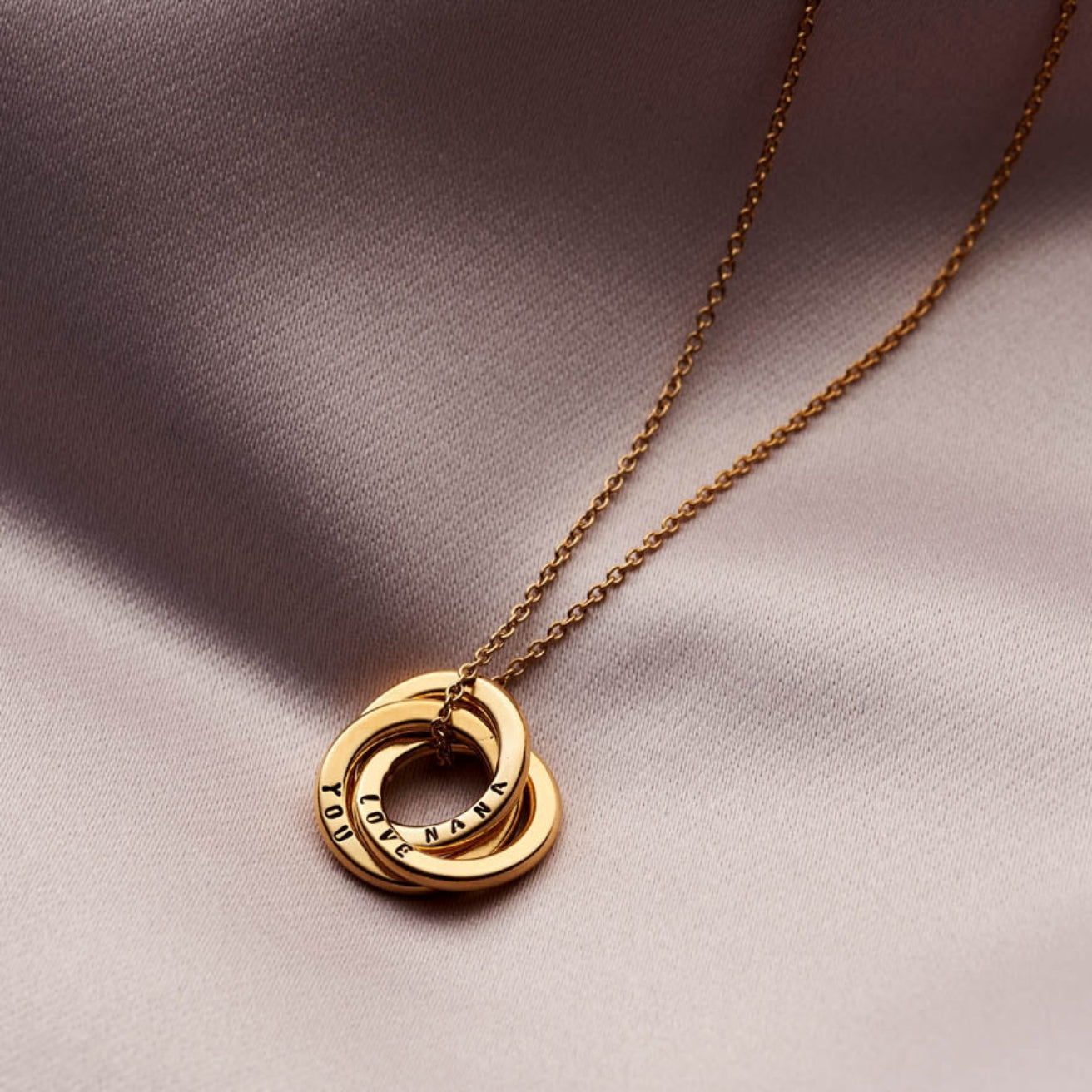 The beautiful Personalised Mini Russian Ring Necklace is one of our most popular designs, with three delicate rings that intertwine to create a symbol of everlasting love. Handcrafted from fine Sterling silver with the option for 18ct rose or yellow gold plating, each delicate ring can be personalised with up to 9 characters for a truly special touch. Popular personalisations include names and special dates, or if you would prefer your necklace without personalisation please leave the text boxes blank. Classic with contemporary simplicity, the Personalised Mini Russian Ring Necklace makes the perfect gift.