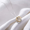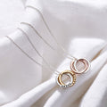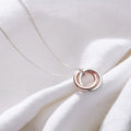 This gorgeous take on our classic two-ring Russian ring necklace is made from Sterling Silver. One ring is left silver while the other is plated in your choice of 18ct Yellow Gold or 18ct Rose Gold. Our jewellers can also personalise this necklace with your words, perfect for names or special dates.