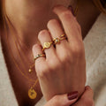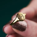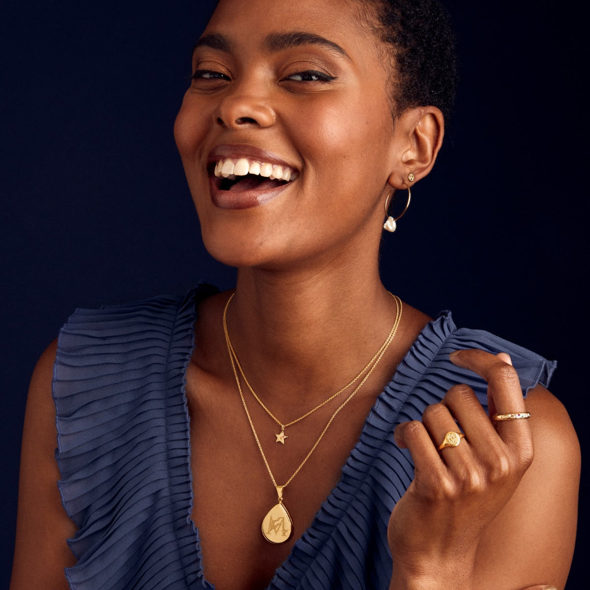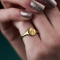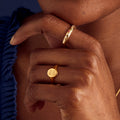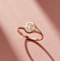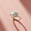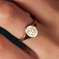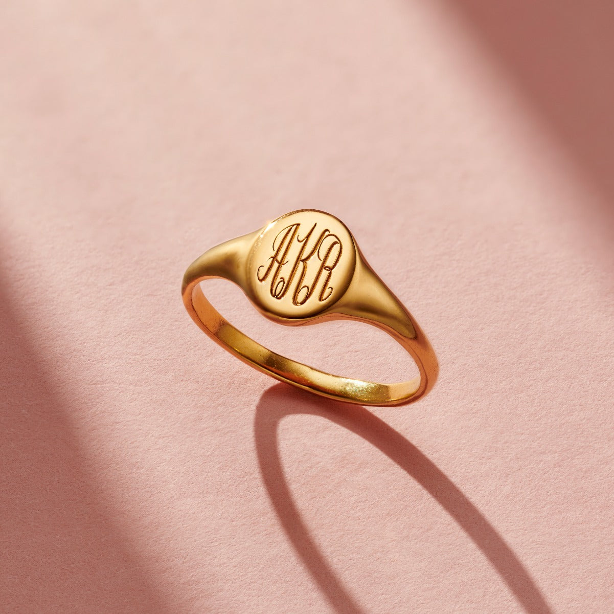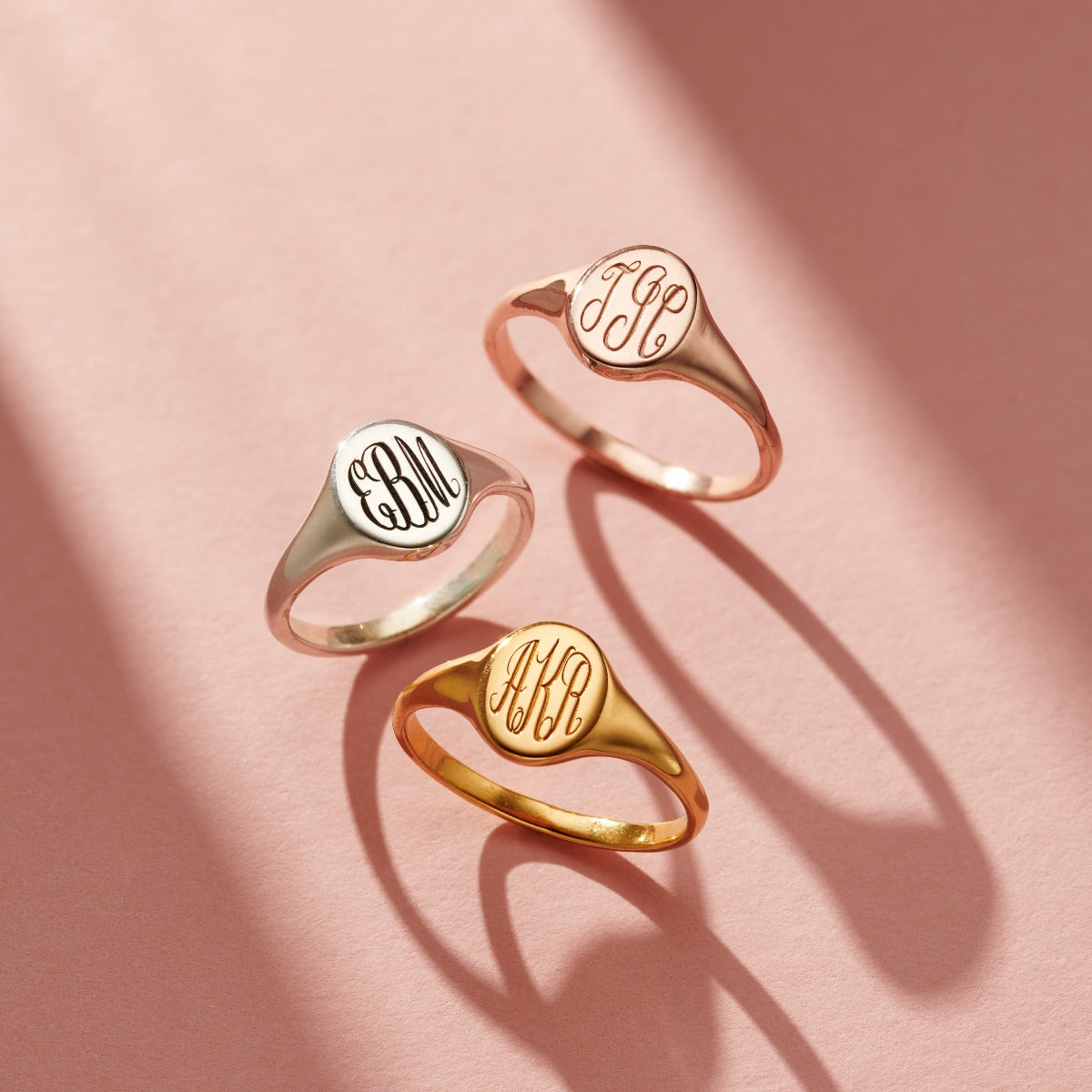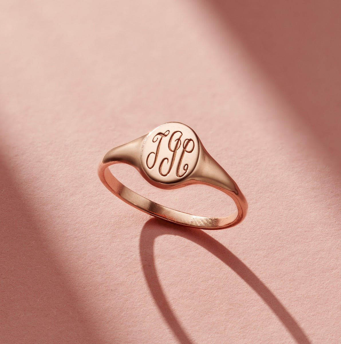 The Personalised Monogrammed Signet Ring is a beautifully contemporary take on the traditional signet ring, crafted from solid Sterling silver. Originally used for embossing wax seals in the Middle Ages, engraved signet rings are now largely worn as a means of personal expression, to celebrate the wearer's initials or family crest. The Personalised Monogrammed Signet Ring is delicately engraved with your choice of letters and can also be plated with 18ct rose or 18ct yellow gold for an extra special luxe touch. Signet rings were traditionally worn on the little finger, but we are always happy to break tradition and celebrate the individual and this looks amazing worn on alongside other silver and gold rings on any finger!