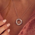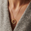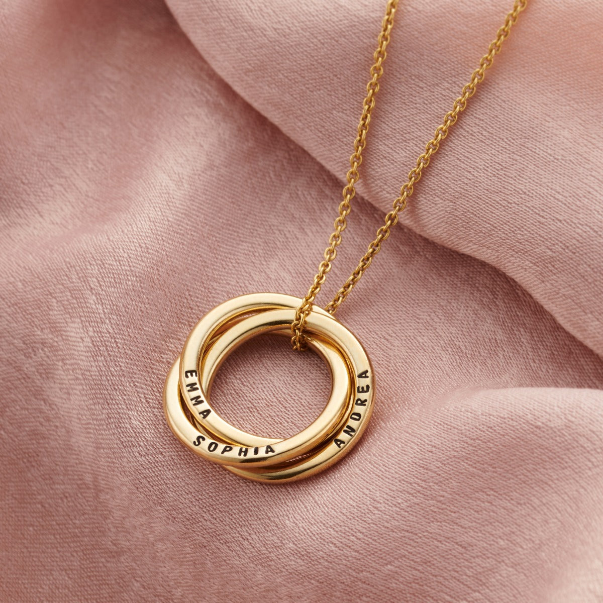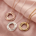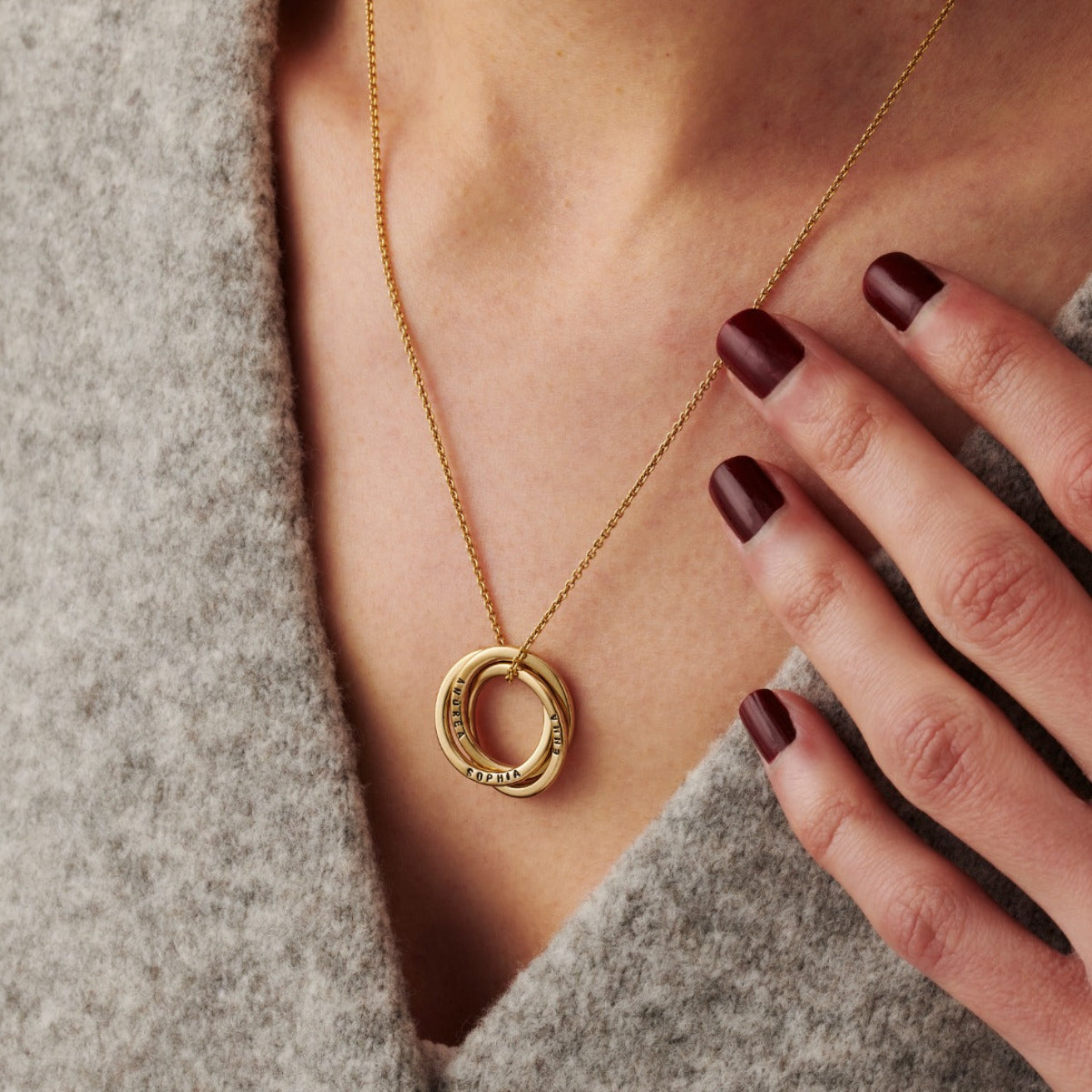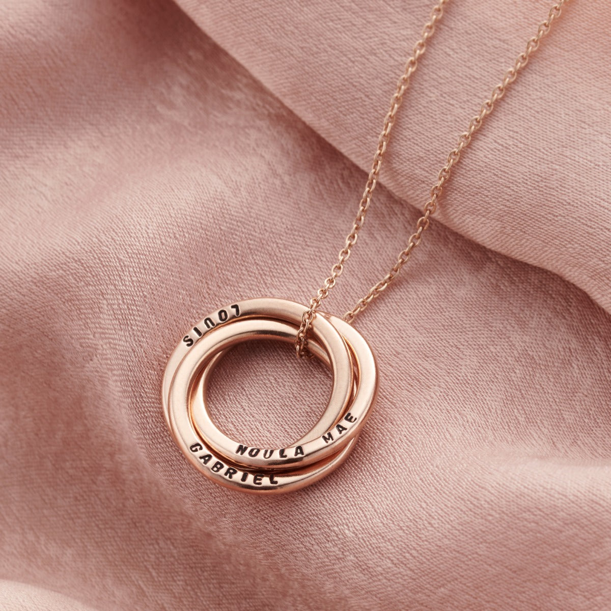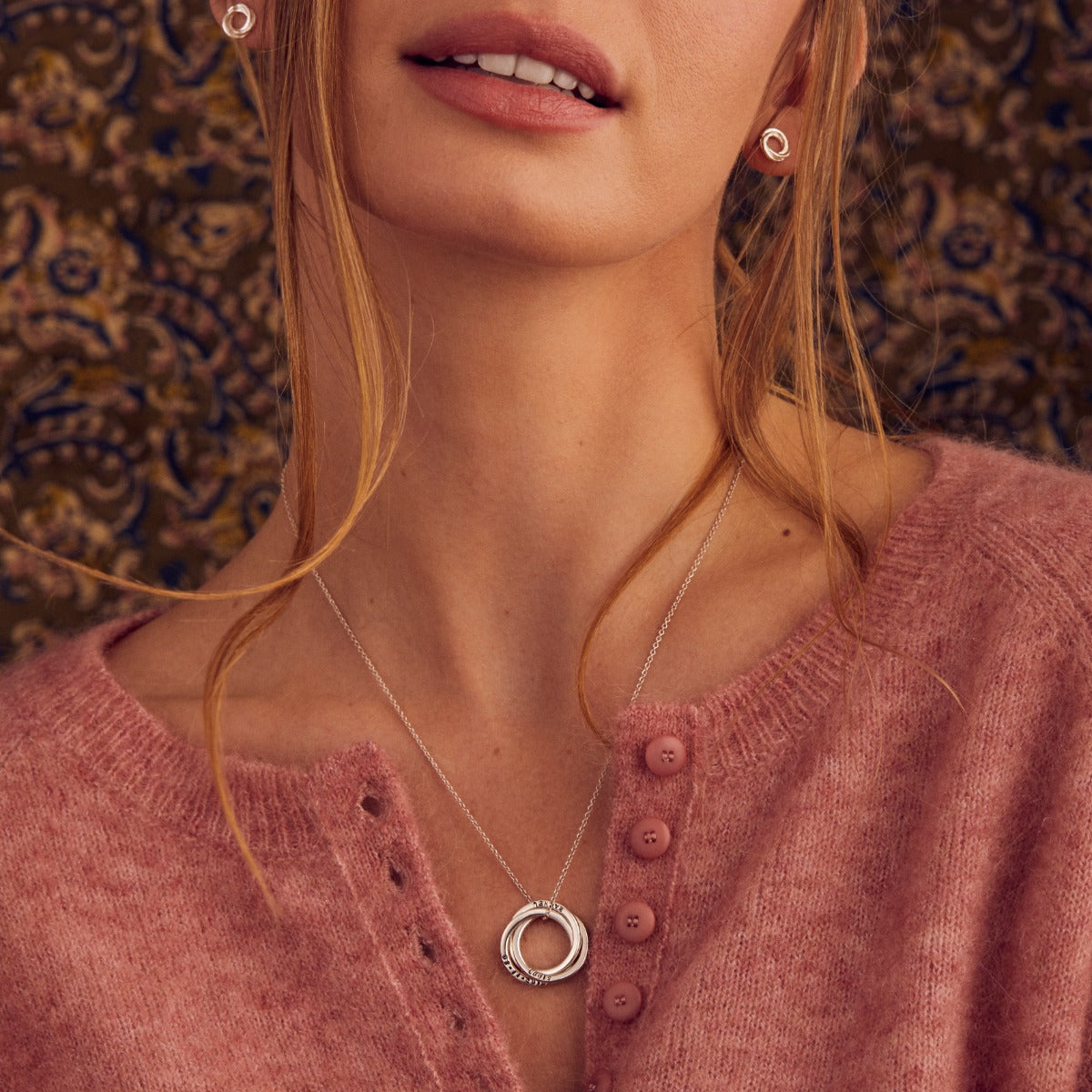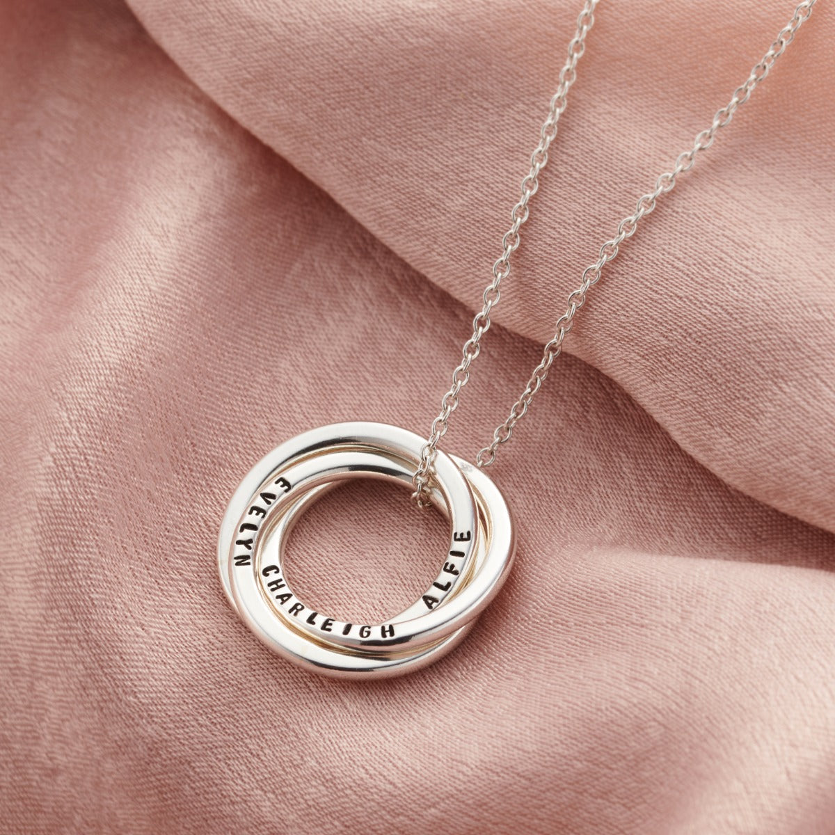 One of our bestselling designs, the beautiful Personalised Russian Ring Necklace is handmade from sterling silver in our Brighton workshop. The Russian Ring is traditionally said to symbolise the notion of endless love, with three intertwined rings bound together inseparably. The Personalised Russian Ring Necklace can be hand-stamped with your choice of message, we love the thought of personalising each ring with a family member's name or meaningful date to create a truly unique keepsake. Each bespoke necklace is individually handcrafted to order by our skilled jewellers and can be plated with 18ct gold for an extra special touch.