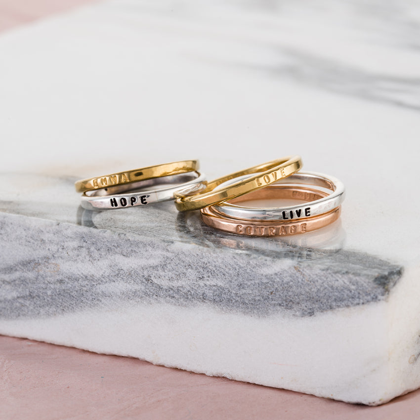The gorgeous Personalised Stacker Ring can be personalised with your own message, creating a unique piece of jewellery that makes the perfect gift (or even a little treat to yourself!). The sleek hammered Sterling silver band of the stacking ring can be personalised with up to 12 characters using our signature hand-stamping technique. Optional 18ct rose gold or 18ct yellow gold plating is available and choose from bold black or subtle clear finish for the text. Each stacking ring is individually handmade in our Brighton workshop.