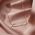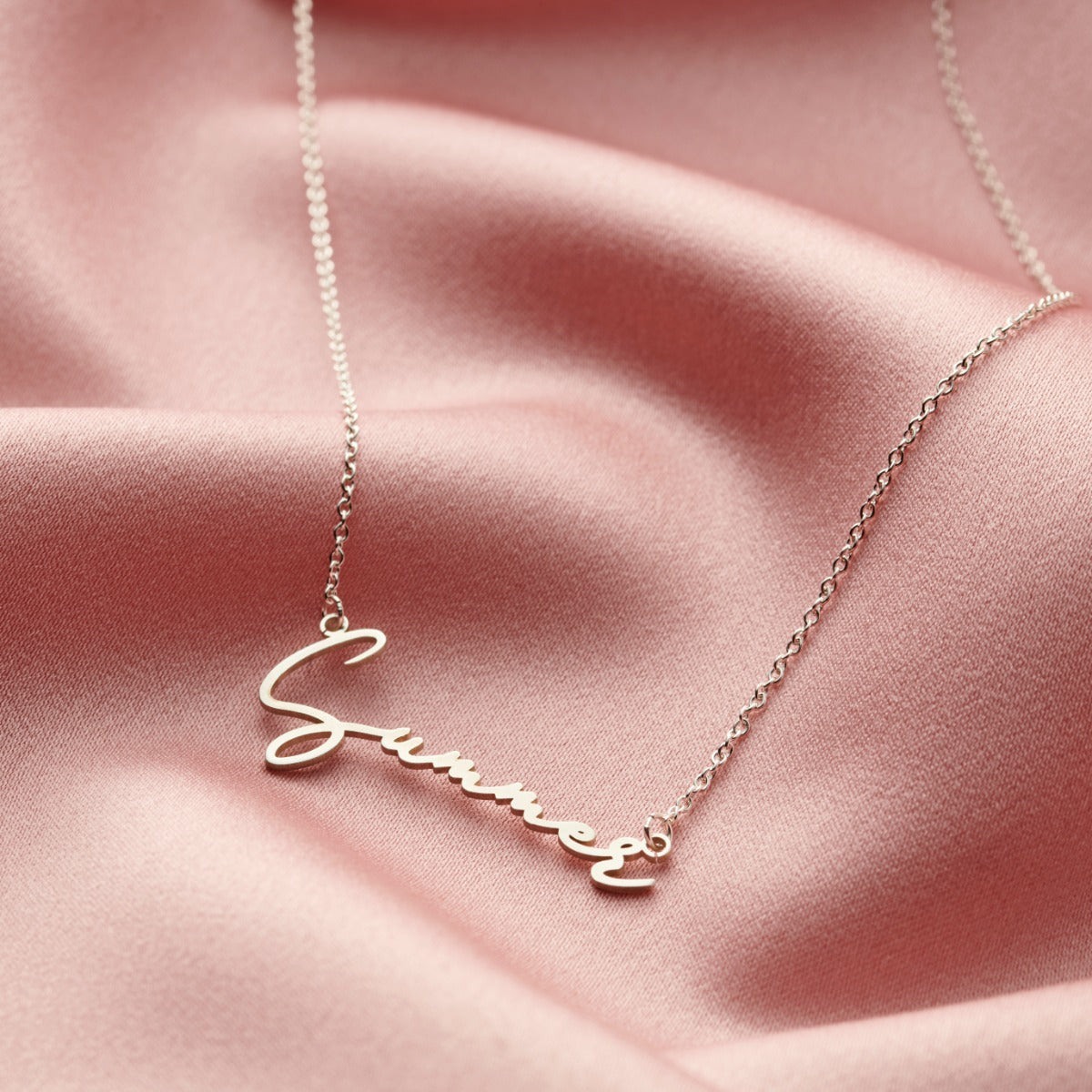 This gorgeous take on the Carrie style necklace is made in our Brighton workshop. Using sterling silver our jewellers cut out your chosen name in a styling script font. Then suspend it from a stunning silver chain. You can also have your script name necklace plating in either 18ct Yellow Gold or 18ct Rose Gold. Sent to you or your loved one in our Luxe Navy jewellery boxes, this personalised necklace is the perfect gift.