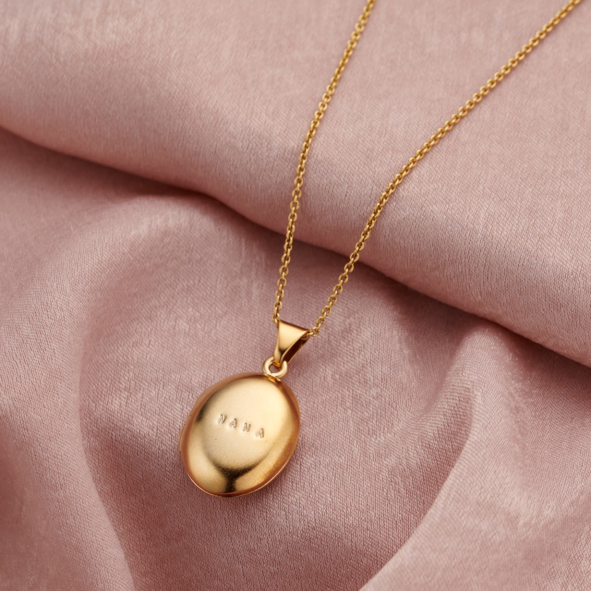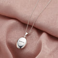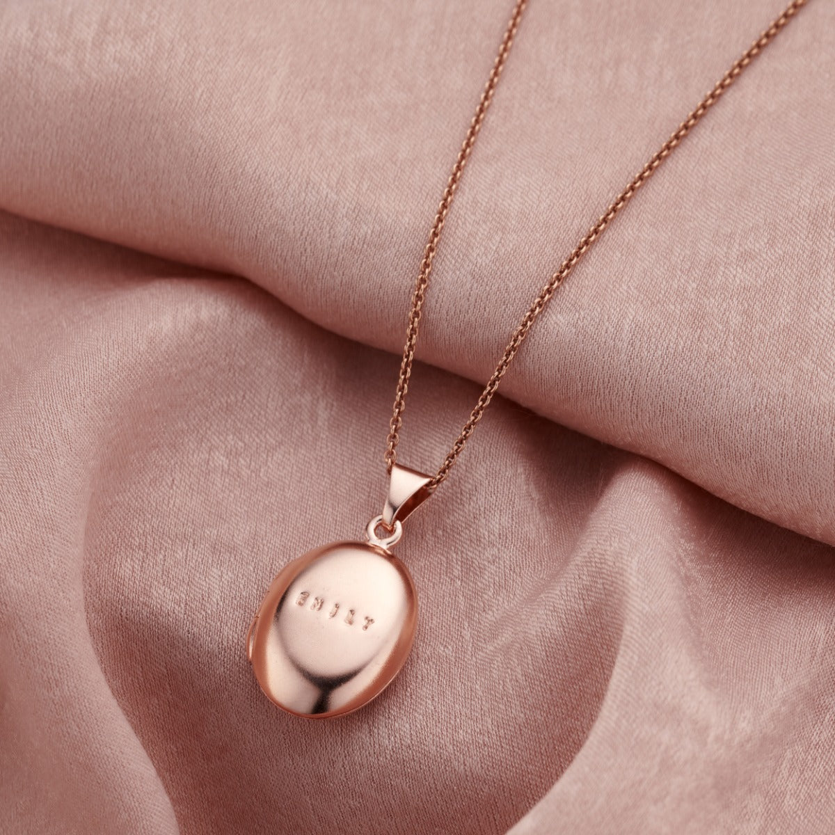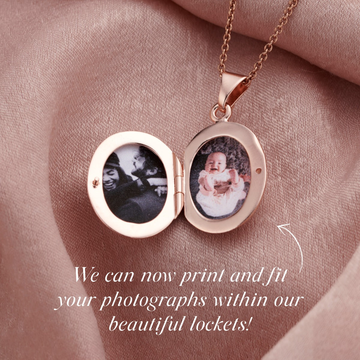 This classic style locket necklace is made from beautiful Sterling Silver. Suspended from a dainty silver trace chain, the locket is double-sided inside so you can enclose up to two photos, one on each side. Our jewellers can also personalise your locket with a short name or date, making your locket truly unique.