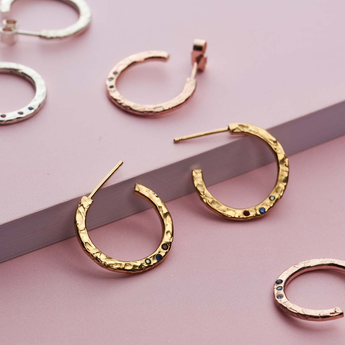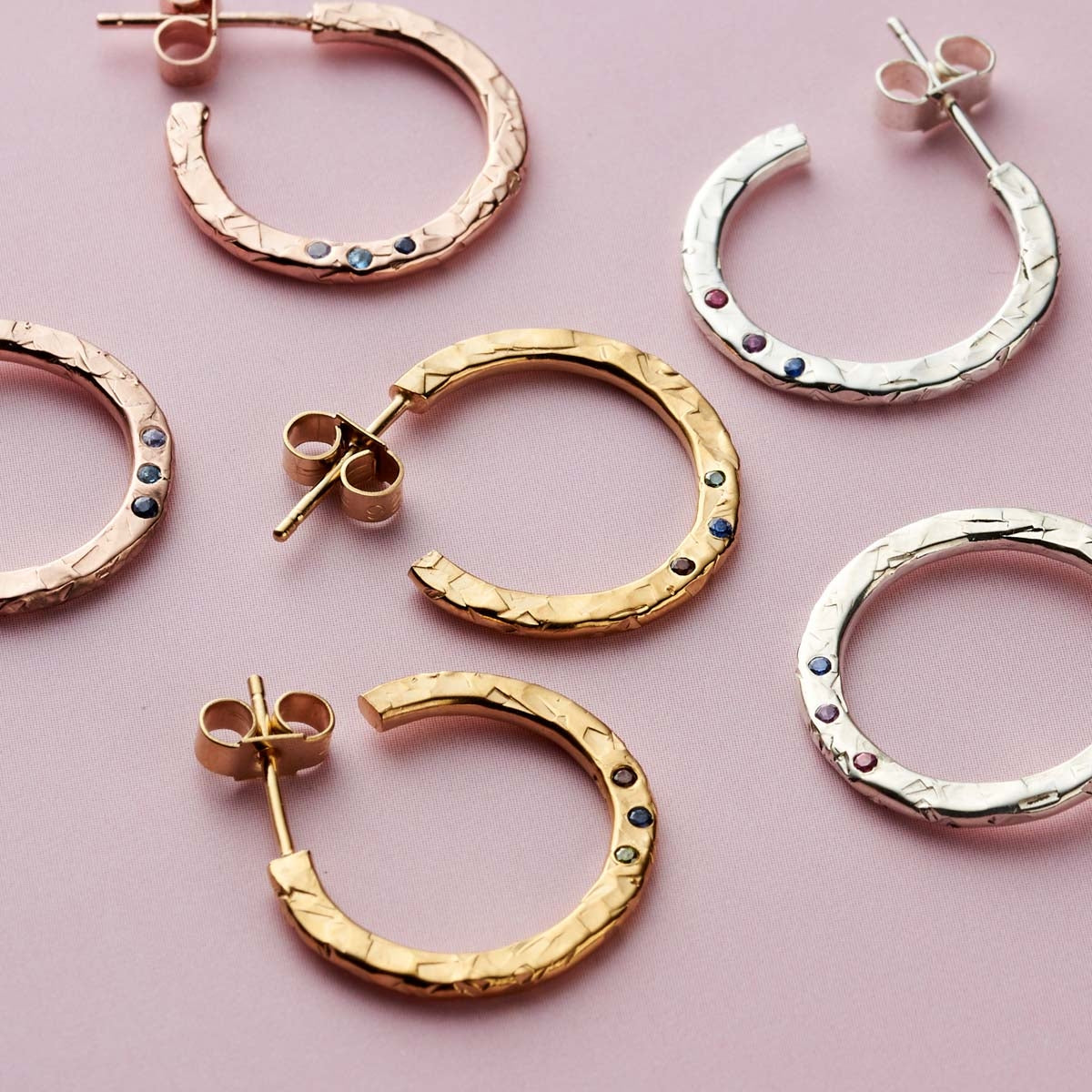 Chose up to 3 significant birthstones and our jewellers will handset them for you in our Brighton workshop to resemble falling confetti, The Sterling silver surface of these pretty hoops have a hand-hewn rustic texture which perfectly shows off the sparkling gems and you can opt for having them plated in 18ct yellow or rose gold. The hoops are fastened with a butterfly clasp and look eye-catching worn with the Posh Totty Designs Rainbow Confetti necklace and bangles. These earrings would make a gorgeous gift to mark a special birthday and come presented in a Posh Totty Designs gift box.
